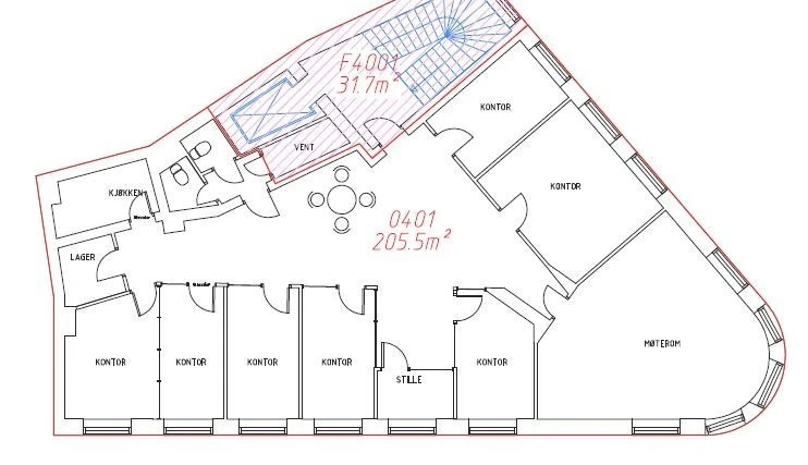 Eiendommen har en flott buet fasade, det ledige kontorlokalet ligger i 4.etg med store vindusflater ut mot Akersgaten og Grensen. Kontorarealet er på 241 kvm brutto, 205 kvm netto. Lokalet kan overtas som det er eller tilpasset ny leietakers ønsker, nåværende planløsning består av enkeltkontorer, møterom, sosiale soner, kjøkken og to toaletter - se plantegning.