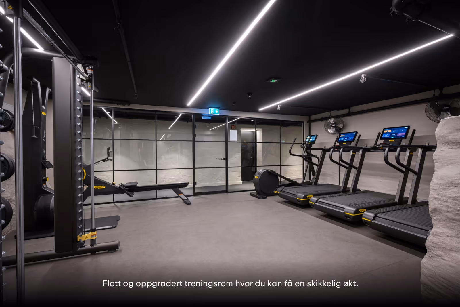 Bygget har et velutstyrt treningsrom med garderober, dusj og håndkleservice, samt praktiske oppbevaringsløsninger og tørkerom – perfekt for deg som velger en aktiv vei til jobb.