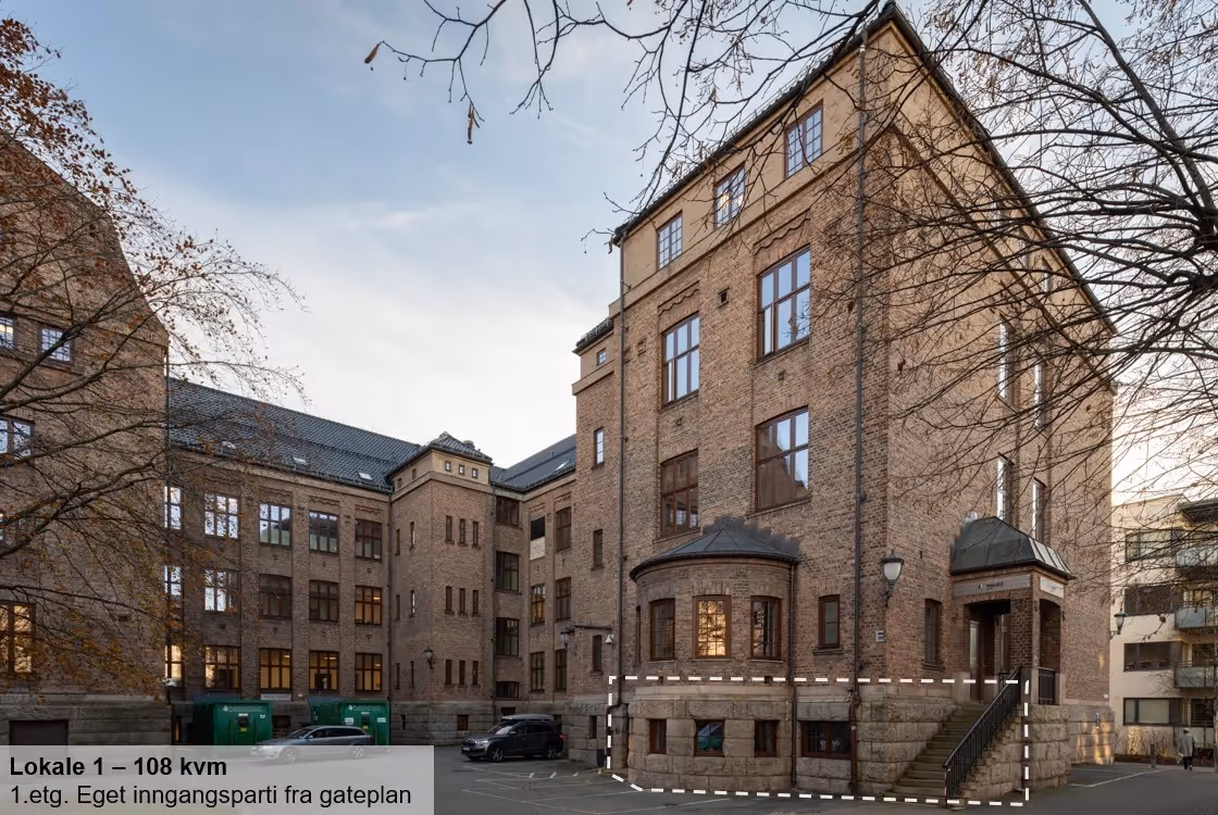 - Lokale 1: 108 kvm BTA. Lokalene har eget inngangsparti fra gateplan og består av flere behandlingsrom/kontorer samt kjøkken og toaletter og har tilgang til fellesfasiliteter.