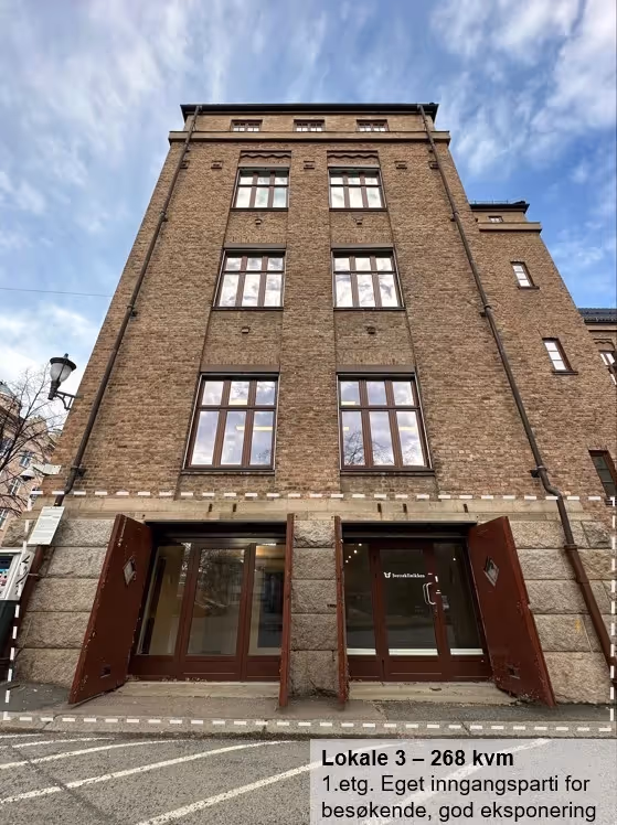 - Lokale 3: 268 kvm BTA. Lokalet har inngang fra gateplan og består i dag av et stort åpent rom/landskap samt kjøkken. Tilgang til toaletter og fellesfasiliteter.