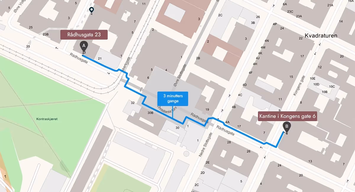 Leietaker kan benytte kantine i Kongens gate 6, som driftes av Furset Kantine. Kantinen ligger tre minutters gange unna, og lunsj serveres mellom kl. 11.00 og 13.00.