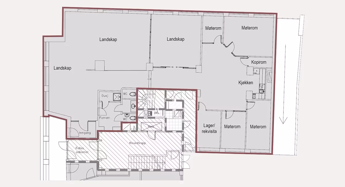 Kontorlokalene har egen inngang direkte fra gateplan og en gjennomtenkt planløsning som passer både for åpen løsning og cellekontor.