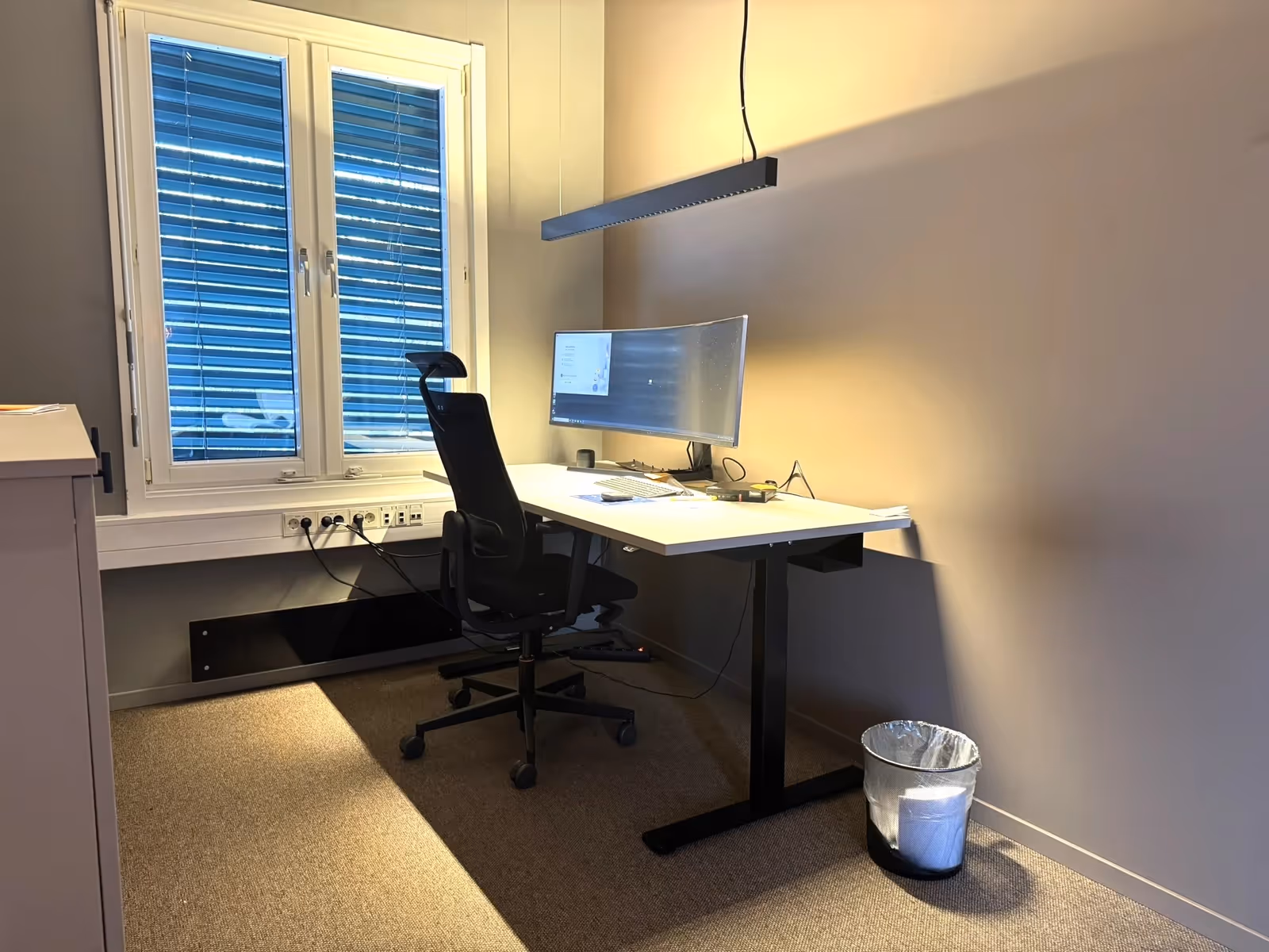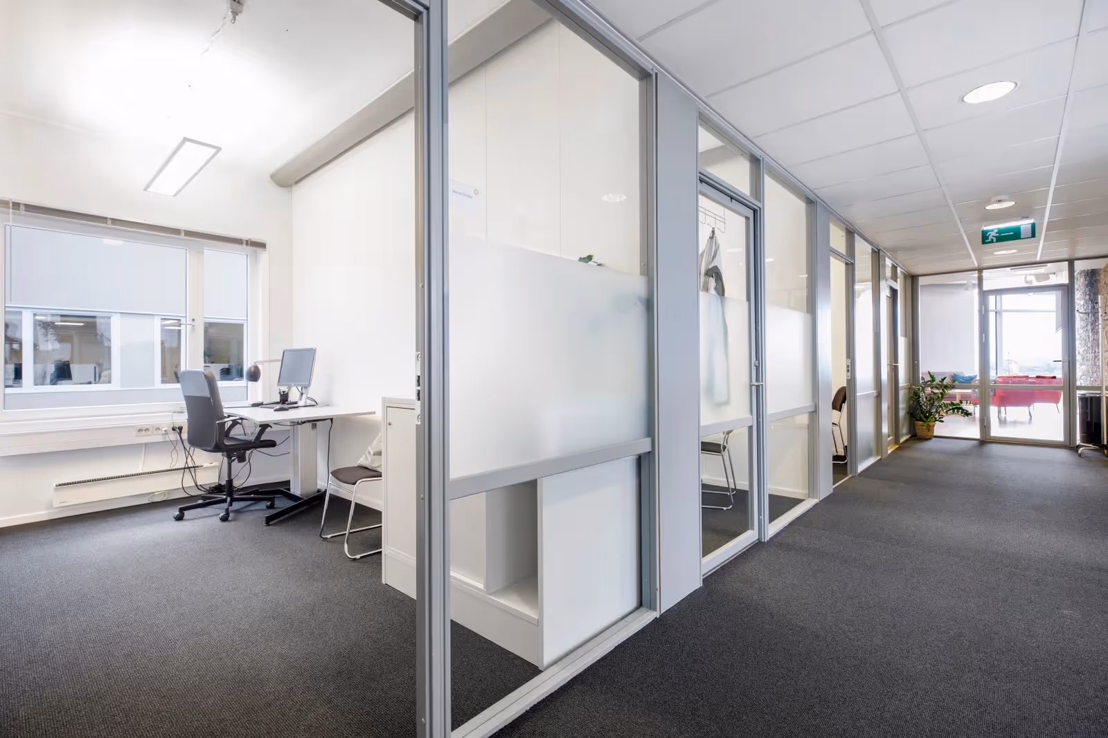 Inndelingen er basert på cellekontor og med god standard, god takhøyde og store vindusflater. Kjøkkenkrok deles med leietaker på etasjen.